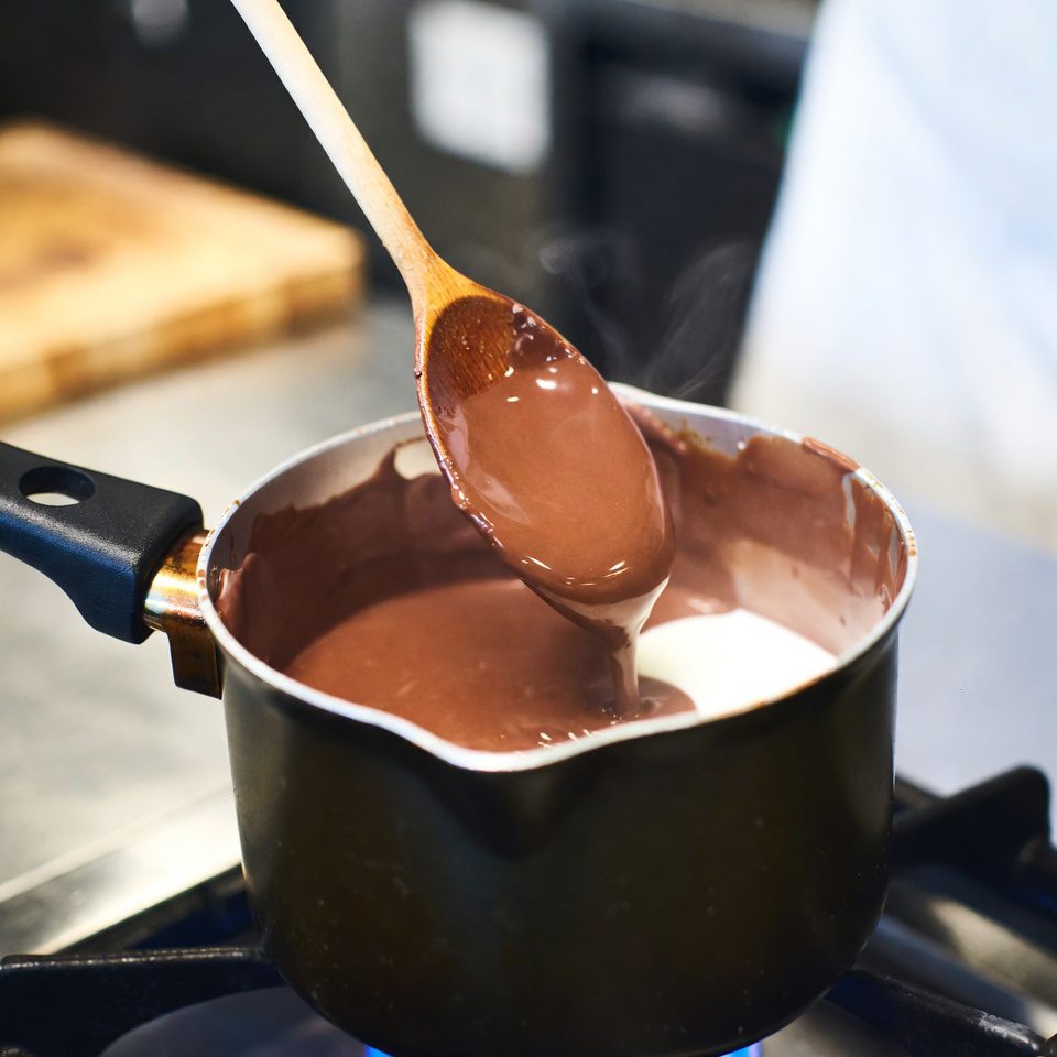 - Prepare the chocolate base.In a small saucepan over low heat, melt the dark chocolate with the milk, stirring gently until smooth and thick. The texture should resemble drinking chocolate, not syrup.
